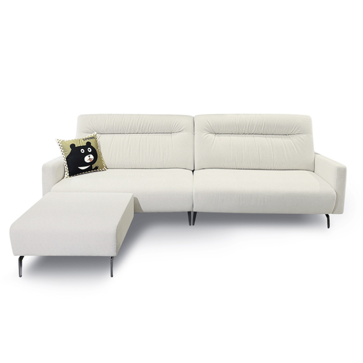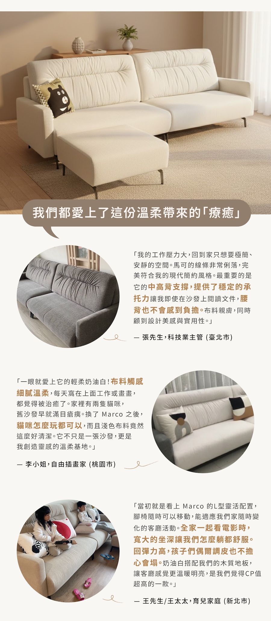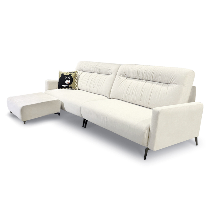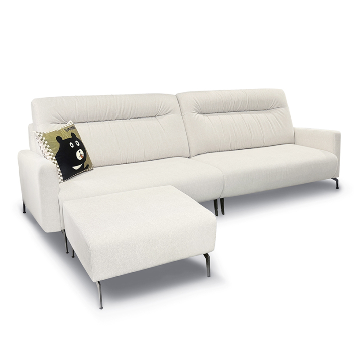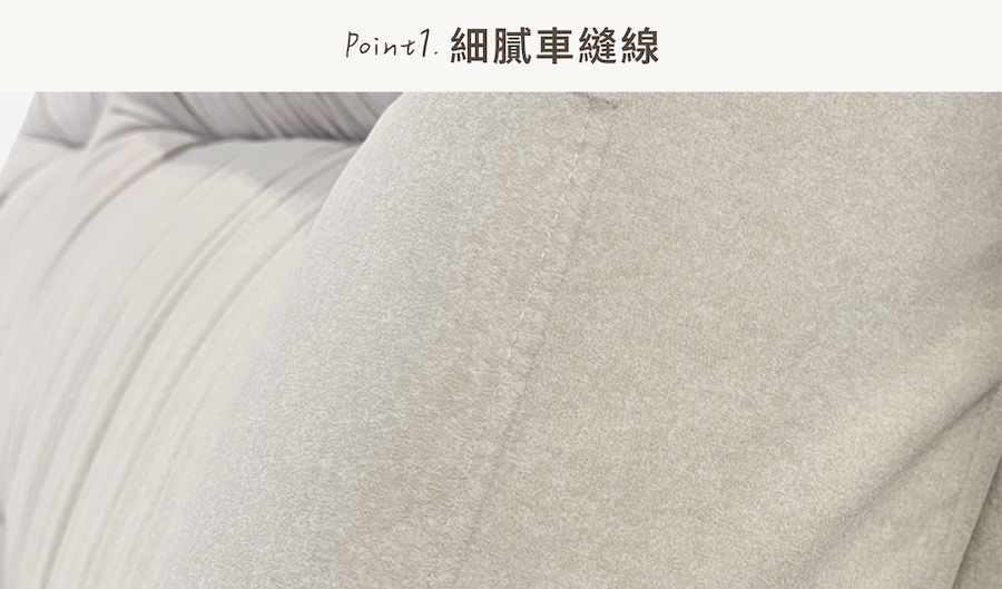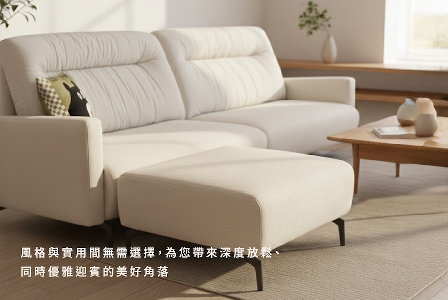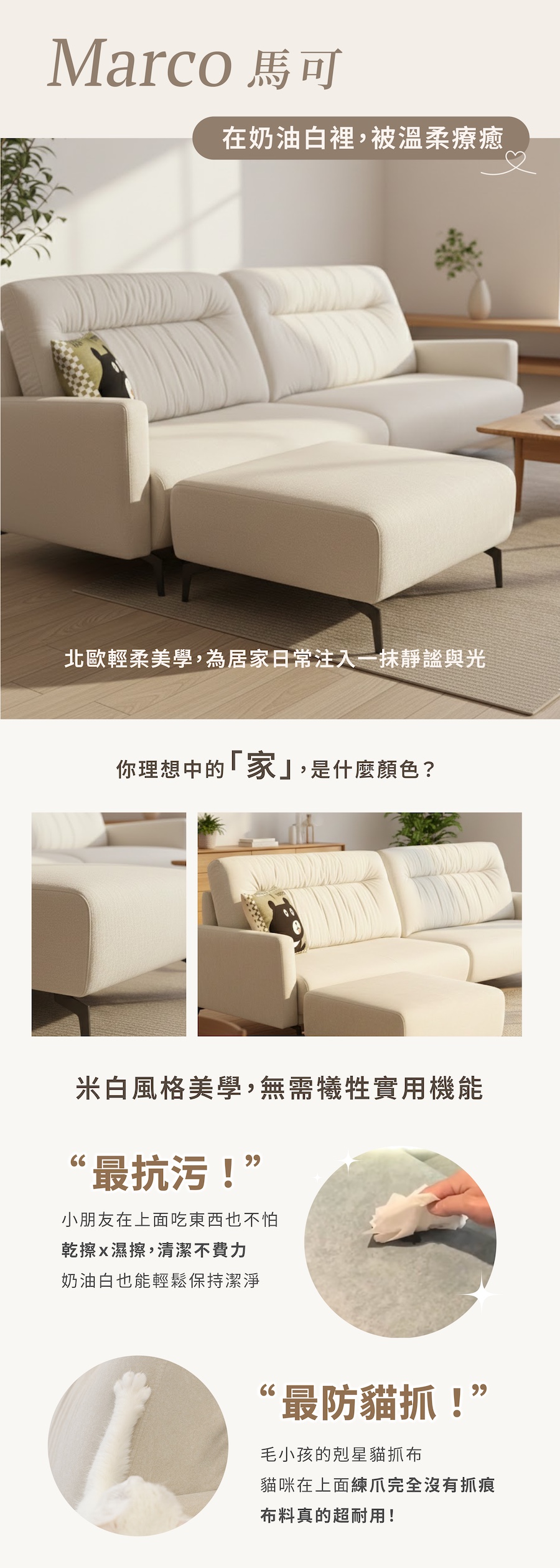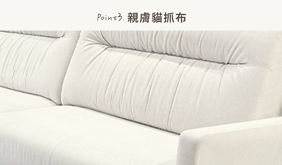 Marco 沙發以俐落的線條設計與溫潤的米白貓抓布料打造